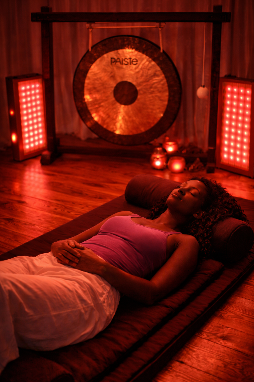 Lying beneath the red light panels while the resonance of the gongs guides your brainwaves into deep rest.